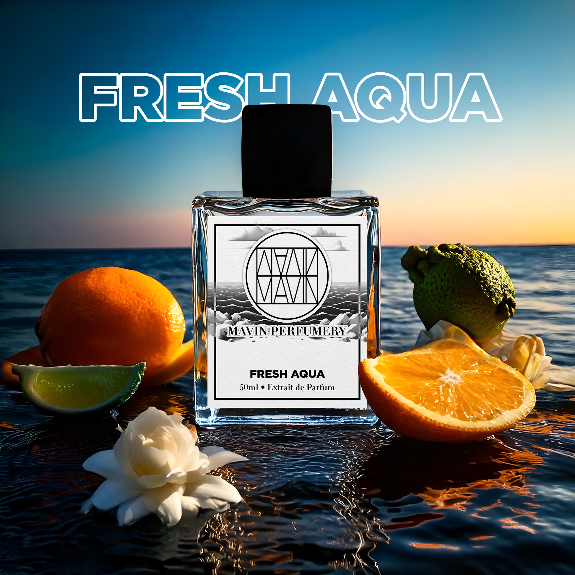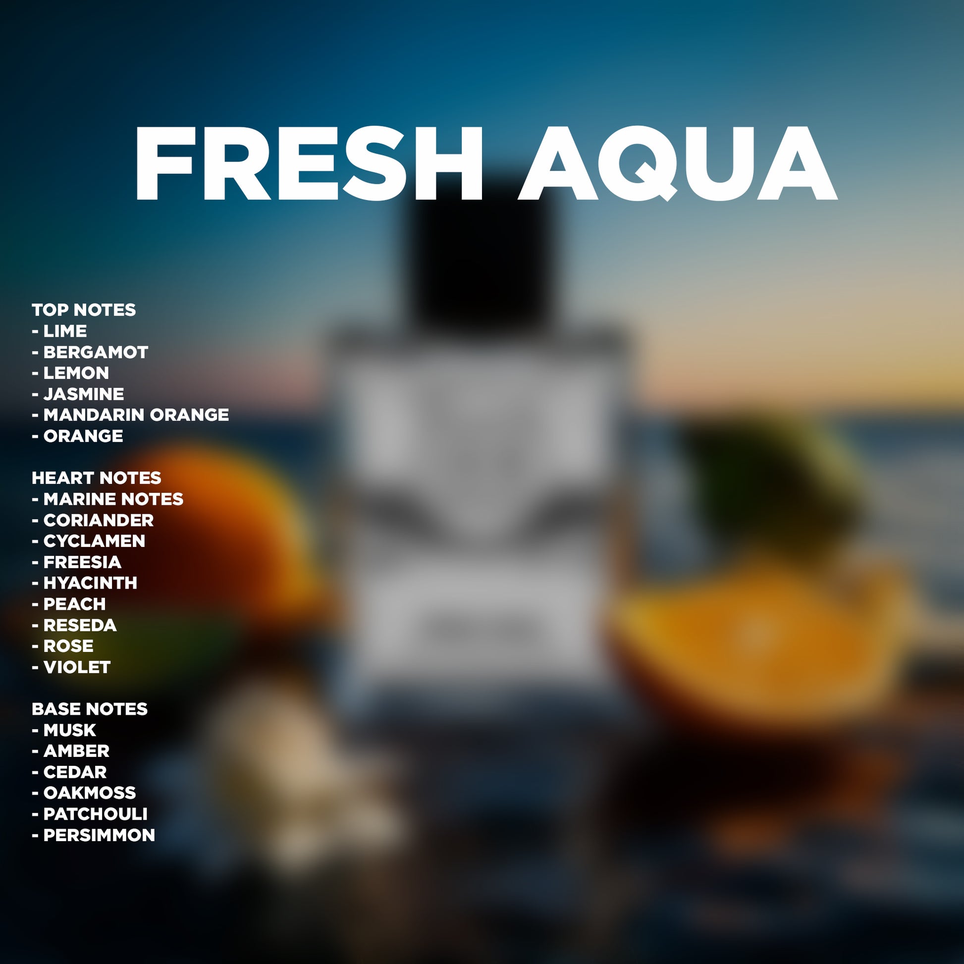 Fresh Aqua is a revitalizing escape to the sparkling shores of an endless summer. It begins with a vibrant burst of lime, bergamot, and lemon, mingling with the sweet allure of mandarin and orange, while delicate jasmine adds a touch of floral freshness. The heart immerses you in the invigorating embrace of marine notes, enhanced by the soft elegance of cyclamen, freesia, and hyacinth, while hints of rose, violet, and peach lend a subtle complexity. As the journey concludes, warm musk and amber blend seamlessly with earthy cedar, oakmoss, and patchouli, while a whisper of persimmon leaves a clean, lasting impression. Fresh Aqua is a celebration of vitality, clarity, and effortless elegance.